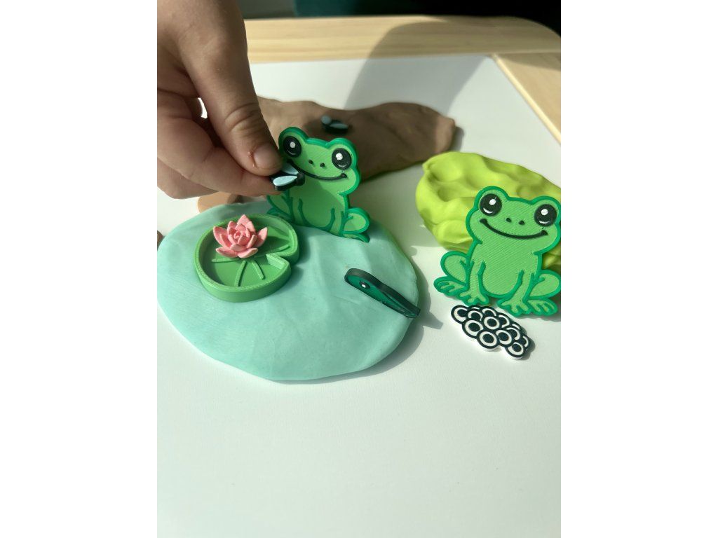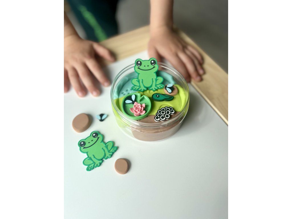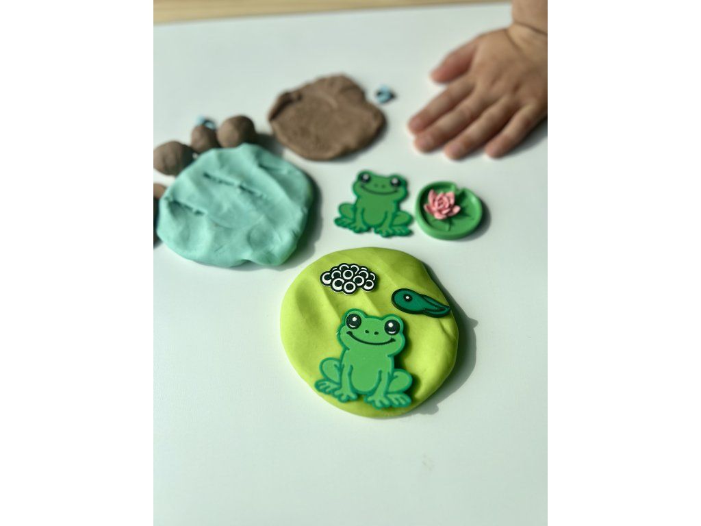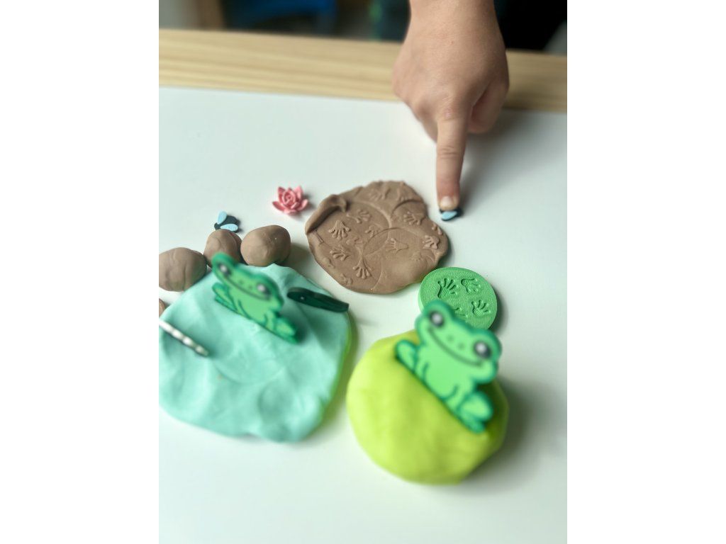 Naše modelíny neobsahují jen „obyčejné“ figurky, ale i další prvky, které podporují volnou hru a dětskou fantazii. Každá modelína obsahuje jeden speciální doplněk, který umí něco navíc. U žabkové modelíny je to leknín, který má ze spodní strany obtiskávátko žabích stop.