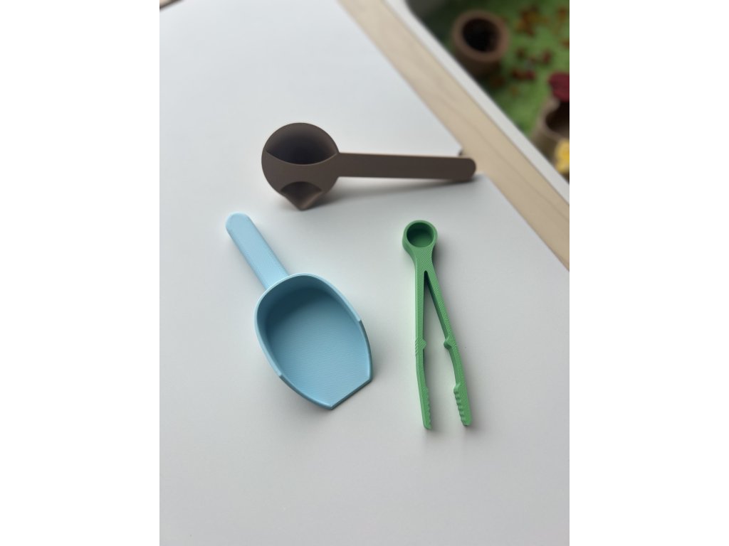 • Pinzetu s malou lžičkou – ideální na přenášení drobných předmětů, trénink úchopu a koordinace (2x11x1 cm)