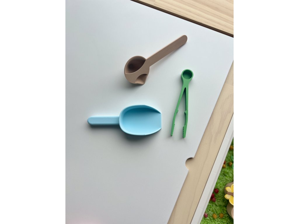 • Velkou lopatku – skvělá na přesýpání rýže, cizrny, písku nebo kinetického materiálu (5x12x2,2 cm)