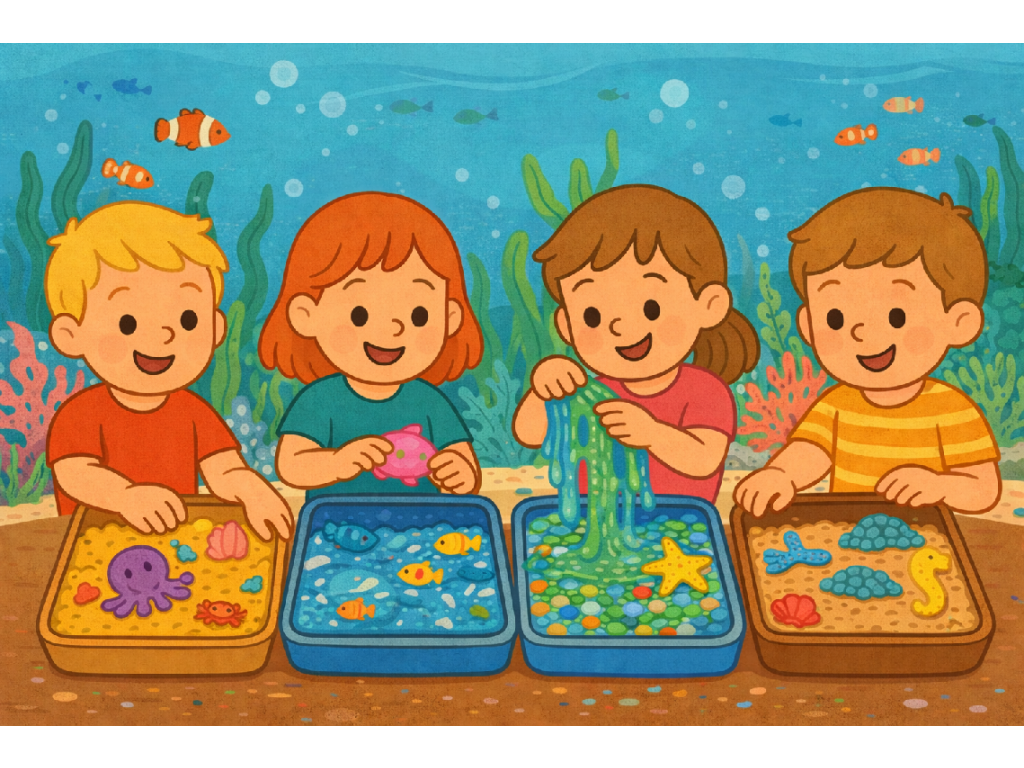 Vydáme se do hlubin plných smyslového hraní. Děti budou objevovat podmořská zvířátka, mušle, vodní svět, ponorky i barevné poklady ukryté na dně oceánu.