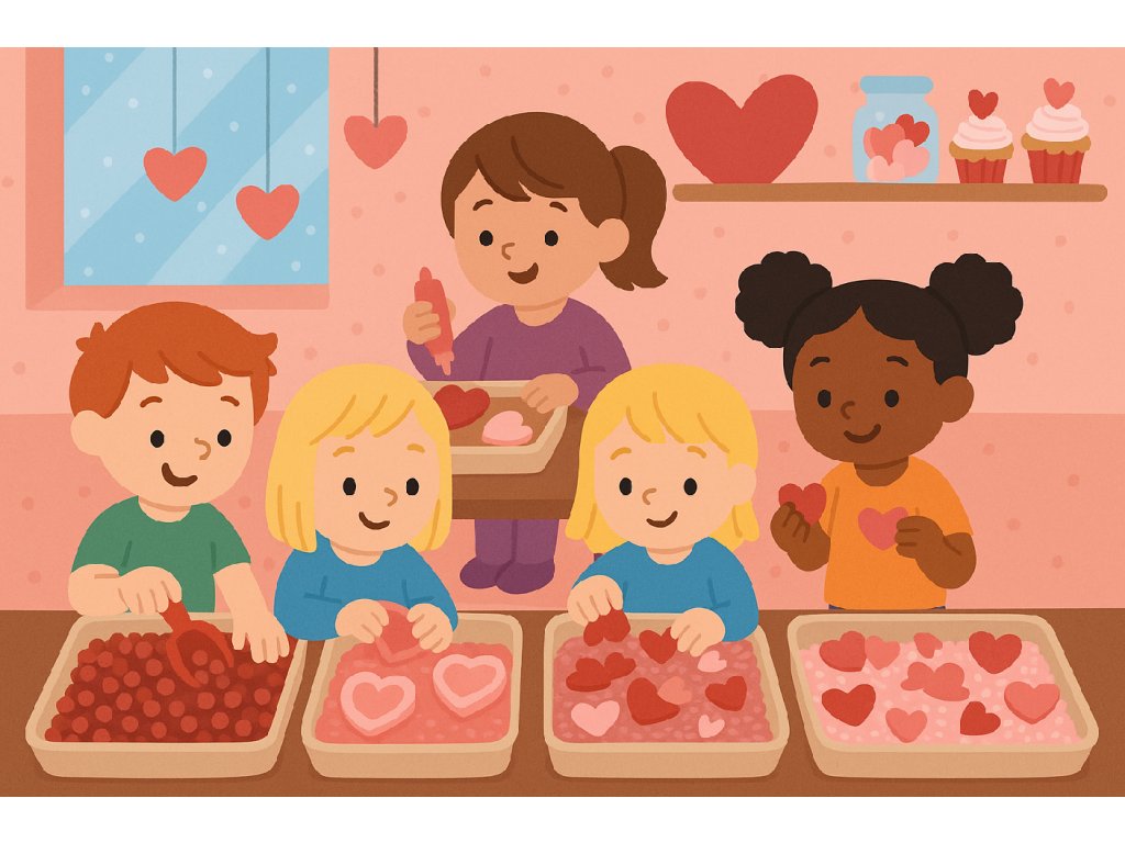Láska prochází žaludkem – v naší valentýnské cukrárně si děti užijí sladkou smyslovou hru plnou míchání, tvoření a hravých „dobrot“.