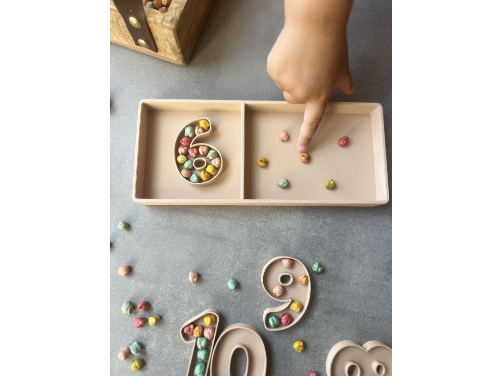 Multifunkční tácek - do jedné přihrádky můžete dát číslo, do druhé dá dítě daný počet předmětů nebo dáte nějakou barvu a dítě dává do druhé přihrádky předměty dané barvy atd.